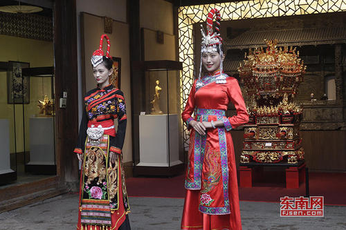 畲族服饰分布在罗源、连江 等各个畲族居住区,畲族男子的服装式样有两种:一种是平常穿的大襟无领青色麻布短衫;另一种是结婚或祭祖时穿的礼服,红顶黑缎官帽,青色或红色长衫,外套龙凤马褂,长衫的襟口和胸前有一方绣有龙的花纹图案,脚案白色布袜,圆口黑面布底鞋。而妇女服饰因居住地区不同,款式各异,但均独具鲜明的特色,而且五彩缤纷,极具观赏性。其中大多是用自织的苎麻布制作的,有黑蓝两色,黑色居多;衣服是右开襟,衣领、袖口、右襟多镶有彩色花边。(福州市委宣传部 供图) |