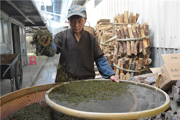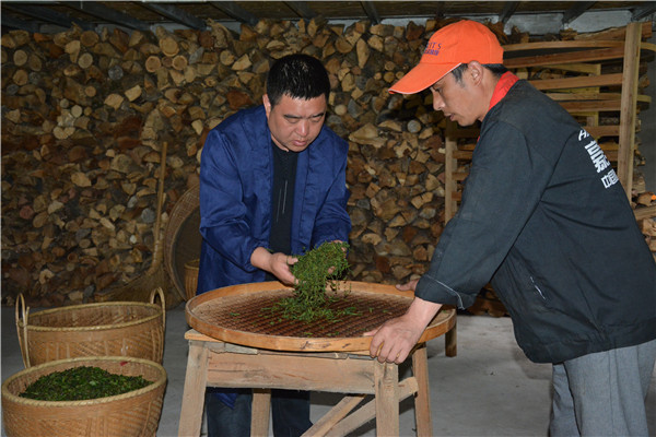 光泽种茶、制茶历史较为久远,光泽司前干坑小种红茶是光泽历史上的两大名茶之一,早在17世纪初就远销欧洲,曾被英国皇室选为皇家红茶。光泽县司前乡干坑地处武夷山国家级自然保护区内,海拔900至1600米。这里青山绿水,云雾缭绕,土质肥沃,是茶树生长得天独厚的环境。这里茶农还是坚持传统手工制作茶叶为主,他们按传统工序制茶:萎凋、揉捻、发酵、过红锅、烟烘。干坑小种制作工艺与其它红茶不同的是:多了过红锅杀青与烟熏干燥这两道工序。 红茶制作技艺(光泽干坑)于2018年9月被南平市政府公布为第六批市级非物质文化遗产项目名录。(南平市委宣传部 供图) 2018年5月,肖育平翻检茶叶,加温萎凋。(高群 摄) 2018年5月,肖育平指导徒弟手工揉茶。(高群 摄) 2017年4月,烟烘前将茶叶均匀的撒在特制的箩筐里。(高群 摄) 2017年4月,烟烘是小种红茶制法的特点。(高群 摄) |