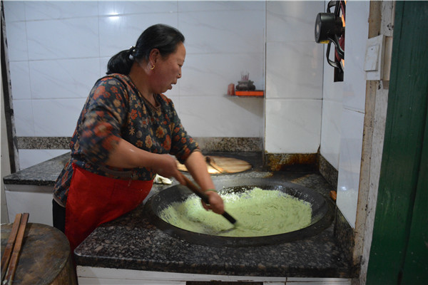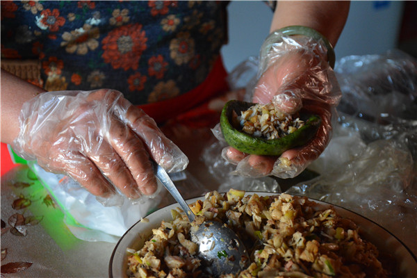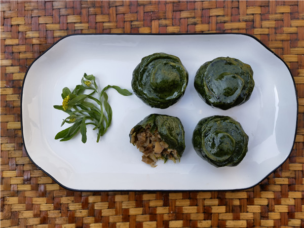 “文子”普通话的称呼就是清明果,本地话“丸子”之意,原是清明时吃的小吃。明末清初时,中原人入闽,把“文子”带了过来,现在是当地四季一种著名的小吃。“文子”的制作也比较简单,是用春夏季四野田头、水溪旁生长的一种绿茸茸、毛绒绒叶子、会开小黄花的水曲草,将其舂烂后加入大米糯米配比磨好的米浆内拌匀,然后放进锅里用小火边煮边搅,煮熟至浓稠泥团状后,铲出放在案板上。再揪下一个个小团撖成皮,将腌熏肉、腌菜、笋、菇、豆子、豆腐、辣椒等“土货”作馅,包成一个个拳头大小、外表绿油油的小菜包,放进锅里蒸熟即可食用。这食物从皮到馅都是“土味”,春夏季节用水曲草,秋冬季节用野艾叶替代。 光泽文子制作技艺于2020年6月被光泽县人民政府关于公布为第七批县级非物质文化遗产名录。 大锅里倒入食用油,加热后将水菊米浆倒入锅中,用小火边煮边搅,煮熟或蒸至浓稠成泥团状后,铲出放在案板上。(高群 摄) 包文子。(高群 摄) 包好的文子绿油油,拳头大小。(高群 摄) |
