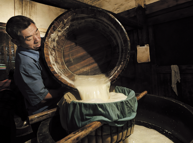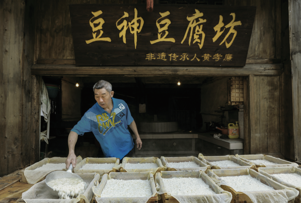 邵武市和平镇传唱着这样一句民谣:“一块豆腐百年酵,一口咬下味百年。”民谣中的“豆腐”即“游浆豆腐”。 和平游浆豆腐与传统的豆腐制作不同,它既不用石膏,也不用盐卤,只用陈浆作为酵母来制作。口感细嫩、味道鲜美,不会对人体产生任何副作用。 2007年,邵武和平游浆豆腐制作工艺被列入第一批市级非物质文化遗产代表性项目名录。(南平市委宣传部 供图) 和平古镇中的游浆豆腐店 制作中 |