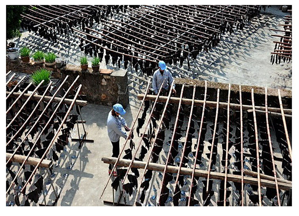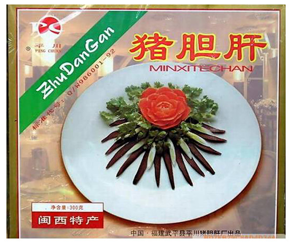 “武平猪胆干”源远流长,历史悠久,是闽西八大干之一。 武平猪胆干外形美观,色泽紫褐光亮,味道香而微甜,甜中带甘,含有多种氨基酸和多种维生素等营养成份,具有生津健胃、清凉解毒功能。其制作最佳时机为“冬至”到“大寒”季节,白霜满地之时。制作猪胆干工序颇多,要经过选、浸、压、晾晒、整形、晾干等。制作好的猪胆干食用方便、快捷,食用前花几分钟将猪胆干用猛火干蒸几分钟后,趁热搽上一层芝麻油,待冷却后切成薄片,再用少许炒熟的蒜叶、冬笋片作配伍即可食用。 挑选无斑点无病害有完整猪胆的新鲜猪肝为主料(宰杀时间不超12小时,农家自养,吃的只有米糠、地瓜藤、绿叶菜类,没有饲喂任何厂家生产的饲料和添加剂,杜绝各种药物和激素进入,其猪肝色泽深褐、质地柔软、脂肪含量低,称之为“糯米猪肝”的猪胆肝最好。 用香料腌制,也可以用纯粮酿造的高浓度白酒;同时适量加入香茅、山苍籽、山奈、香藤根、生姜、木姜子、山辣、野山桔等天然香料,还可以佐配公丁、花椒等中草药。辅料有解毒、杀菌、去腥、增香、防虫、提鲜及降低新鲜猪肝韧性的作用,使猪胆肝风味独特。 涂盐腌制带胆的新鲜猪肝。 晾晒脱溃选择空气干爽的晴天,主料起缸,猪肝的根部主血管处用竹筷横向穿刺,中间用绳子串起,间隔悬挂,吊晒,浙干,脱溃,风干,太阳晒三天左右,猪肝表面干巴;呈紫褐色;晾晒时要防尘防止苍蝇蚊虫叮咬产卵。 拍打整形猪胆肝日晒后,表皮干巴,取下,可以分辨撕开,用木扇板拍打整形,日晒与拍打反复几次,拍打结实,再加平板重物夹压。指标检测晒至猪胆肝的含水率低于30%时,进行感官、理化指标、微生物、净含量各种指标检测,完成猪胆肝的生制品制作过程。 储存武平猪胆肝的最佳地点是谷仓,谷堆既干燥又避光。每年4~10月,把猪胆肝埋在稻谷中保存,以隔湿热,防止变质、生虫,并在保存过程中促使其发酵成熟。 猪胆肝长时间存放时,需要真空包装,冷藏;如果切片蒸熟,真空包装,冷藏,则可以随时开袋即食。 武平猪胆肝的食用方法很讲究,先从整块肝上切下需要的量,盛放于小碟里,然后加入少许的白糖白酒,放入锅内蒸15分钟便熟了。 闽西八大干之一的猪胆肝在传统的工艺加上精美的包装可作为礼品送朋友亲人。 |