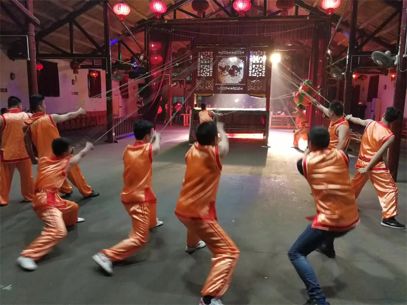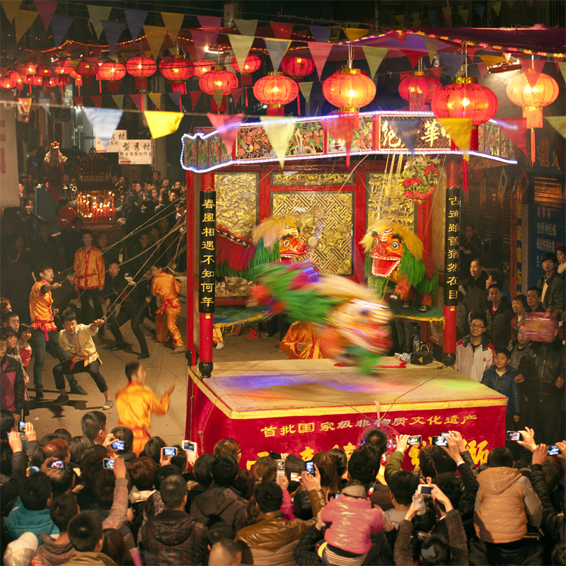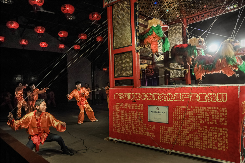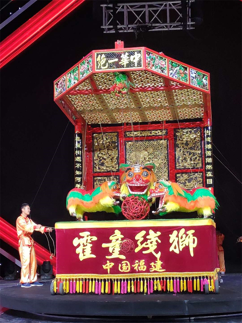 霍童线狮,又称抽狮,当地人称之为“打狮”,线狮表演者站在台后提绳子,人距离狮子少则5米,多则超过10米;十数位训练有素的线狮艺人得分成数组,每组中一人为主,其他人为辅,配合无间;舞狮者以不同的节奏或频率拉扯绳索,表演出狮子的各种动作神态;舞狮者不但要有熟练的技巧,更要有充沛的体力。霍童线狮通过绳索操纵狮子表演各种动作,集文功、武功于一身,其表演有单狮(雄)、双狮(一雄一雌)、三狮(一母二子)、五狮(一母四子)4种形式。线狮表演最早是沿途行进,边走边舞,后转为固定台表演。经过历代民间艺人的实践性创造,线狮的表现力越来越丰富,能表演坐立、蹲卧、苏醒、伸展、登山等各种不同姿态,仅狮子戏球就有寻球、追球、得球等动作。狮子所有的这些动态表演,全凭艺人们集体的操纵和密切的配合加以实现。(宁德市委宣传部 供图) |