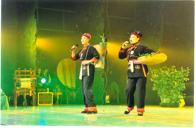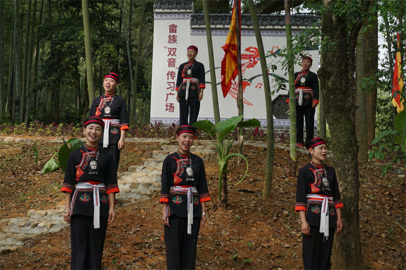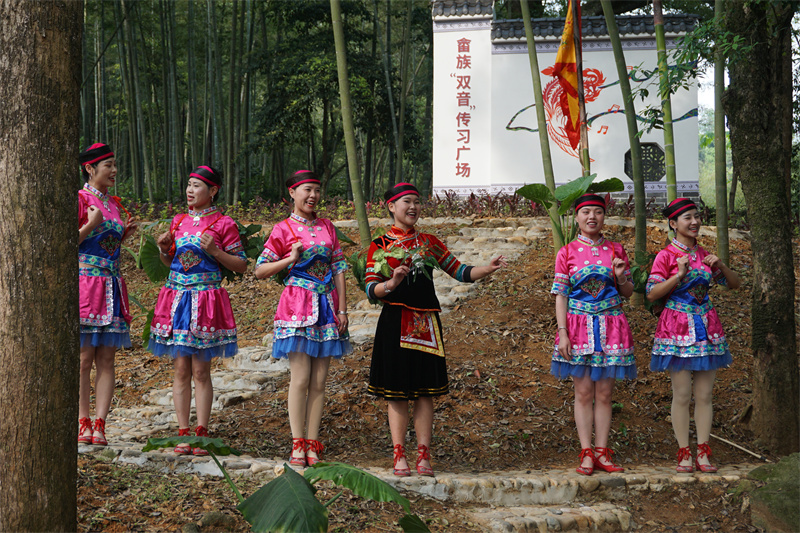 “双音”是畲族歌言中唯一存留的二声部歌种,畬族民间俗称为“跟唱”,亦称“双条落”。其实“双音”是畲族歌言由传统的对唱转变为重唱的二声部唱法。“双音”在对歌中相互比多、比快、比智慧、比肚才,需要歌手歌言功底扎实、思维活跃、反应灵敏,达到艺术提升,由此造就了畲族“双音”。畲族“双音”由男女二人重唱,可以由男的先唱,也可由女的先唱。起唱时第二人可晚进2个字或4个字,最后收尾时步调一致。节奏上有较紧凑和拉长音等唱法,但两个人的节奏基本上是统一的。曲调多为“福宁调”,有时歌手演唱时会有意识地变化自己的声部,以达到丰富的音乐效果。(宁德市委宣传部 供图) |