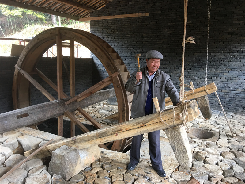 水碓是一种用水力冲击木轮借力舂米的工具,是中国古代传统农用机械。古田凤都镇陈氏家族传统水碓制造技艺符合力学原理,构造精巧,极具科学性,具有很高的历史文化价值和研究价值。水碓寄托着乡民的深厚情感,是构建乡土文化的重要载体和要素。当前,国家正在大力实施乡村振兴战略,承载着乡土文化气息的水碓,可以成为乡村文化的标志性景点,将在美丽乡村建设中,重新焕发生机。2019年2月,传统水碓制造技艺(古田)被福建省人民政府公布为第六批省级非物质文化遗产名录项目。(宁德市委宣传部 供图) 传承人安装碓硾 传承人陈为洞在新建村制造完成的传统水碓 |