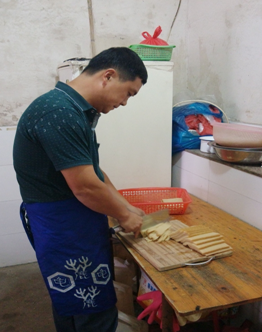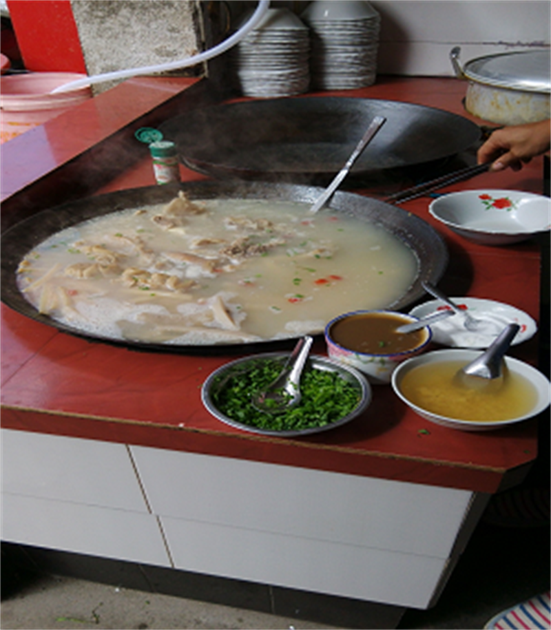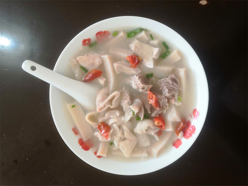 清末,古田鹤塘村黄德修一家人以经营牛羊肉铺为生。有一年,由于旱灾,年底的时候赊出去肉账收不回,眼看就没年过了,主人把牛、羊、猪的骨头、内脏与磨粿切块,一锅混合起来烹煮,没想到这样的味道特别好。黄德修因为肉钱收不回来,第二年就没本钱继续开肉铺。为了一家人的生活,黄德修硬着头皮,将自己的肉铺改成经营煮磨粿的小吃店,不成想人人对这种新兴的小吃赞不绝口,开始人们称其为“磨粿面”。黄德修见生意还可以,就着意沿用原来肉铺“温记”老字号,起名“温记”粿面。很快,粿面这个名词就在鹤塘流传开来。第四代传承人黄聿温经长期学习、研制重新改良了粿面制作的配方,调整适合现代人的口味,稳定了粿面的质量,经其手制作的粿面,汤清、口感好、有嚼头,大受欢迎,已然成为鹤塘酒席一道必备佳肴。2016年1月,粿面制作技艺(古田)被宁德市人民政府公布为第五批市级非物质文化遗产名录项目。(宁德市委宣传部 供图) |