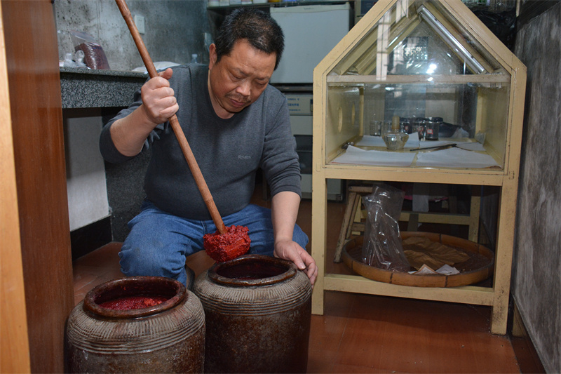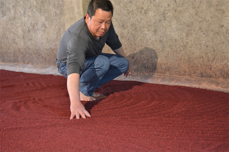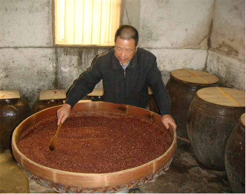 红曲是由一种微生物菌种接种在大米上培养而成,因其颜色红紫优美宛如朱丹,故名红曲。福建省古田县是红曲的发源地,唐开元二十八年(公元740年),古田民间就盛行红曲制作。1915年,古田商帮在福州建立“古田会馆”,组成红曲帮,将红曲销往全国各地和东南亚国家。古田红曲除酿造红曲酒外,因其纯天然、无毒无害是最佳的食品添加剂,现“老才臣”等全国著名食品品牌,都是使用古田红曲进行染色、生香。同时,红曲有消食活血、健脾燥胃、降低胆固醇、降血糖、降血压和防癌的功效,制成如“血脂康”“地奥心血康”“新癀片”等药品广受欢迎。2009年5月,古田红曲制作技艺被福建省人民政府批准为第三批省级非物质文化遗产名录项目。(宁德市委宣传部 供图) |