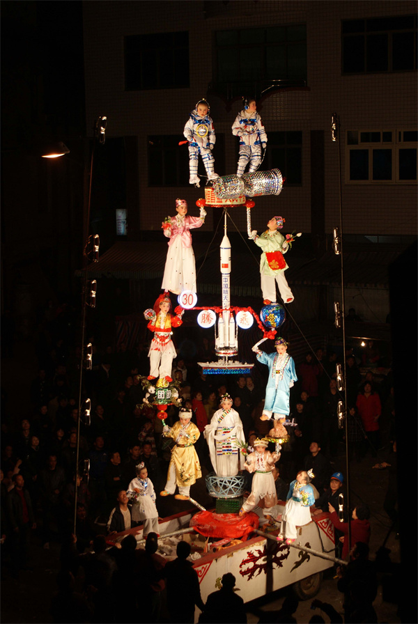 沙埕铁枝2008年列入国家级第二批非遗名录。 沙埕“铁枝”俗称“杠”“阁”,始于清乾隆年间,是沙埕渔家元宵节传统民俗活动。早期是竹、木质结构,用人抬扛,为单层2至3米高,叫平阁。后发展成用钢管或铁条焊接成像树丫那样的枝状,并进行艺术性加工和装饰,为多层的7至8米高,层与层之间称为“过枝”,并固定在车辕上便于搬行。它吸收了民间文艺、传统戏剧、舞蹈杂技等表现方法,形成精妙绝伦的表演艺术。 沙埕铁枝属民族民间群众性文化表现形式,搬铁枝表演同时涉及到机械、服装、美工等技术性工艺,它的背后还需要一整套人马在参与,构成沙埕搬铁枝表演阵容相对庞大的队伍 沙埕铁枝表演方式都是流动性的,其表演主要有两种形式,一种是保留传统的,用肩头来扛铁枝,高度一般只在3米内,保持传统造型,比较古朴、简单,其表演形式更多受到地理条件的限制。铁枝车可推行,乐队随后伴奏,阵容强大极具视觉效果。搬铁枝实际是指铁枝表演的一种过程,要实现这种精彩的表演,关键在于“绑”的工艺上,而铁枝无论从其制作工艺还是表演发展,历时几百年,始终处于一个创新、提高、拓展的过程。 (宁德市委宣传部 供图) 福鼎沙埕铁枝表演现场(贯之摄) 刘端富(前)在讲解铁枝技巧(白荣敏 摄) 沙埕铁枝表演 沙埕铁枝表演 |