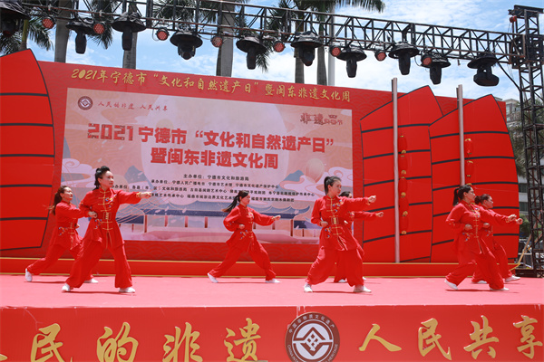 龙桩拳又名龙尊拳,起源于少林,传承于古田县杉洋镇,发展至八闽大地,波及港、澳、台。1984年被国家界定为“福建七大传统拳种之一”,是福建南拳中最具有代表性的稀有拳种,是武术的活化石,珍贵的文化遗产,传统文化的瑰宝。拳术拳势威猛,强捍有力,勇猛剽悍。动作紧溱,整体连贯。讲究精,气,神。聚丹田之气,拳掌并用,攻防合一,"子午"相对乃为立身之本。腿法上,两足落地,落地生根。刚柔相济,就虚避实。吞喉露齿“狮嘴麒麟目”。发出去的拳起着打、攻、防、挡四大作用。拳术秘诀深奥无穷,非上智者不可轻传,非仁义之才不可教习的授徒特点;“未曾习武先习德,未曾授艺先授礼”的师徒传承特征。 2019年2月,“闽东传统武术(龙桩拳)”列入福建省第六批省级非物质文化遗产名录。(宁德市委宣传部 供图) |