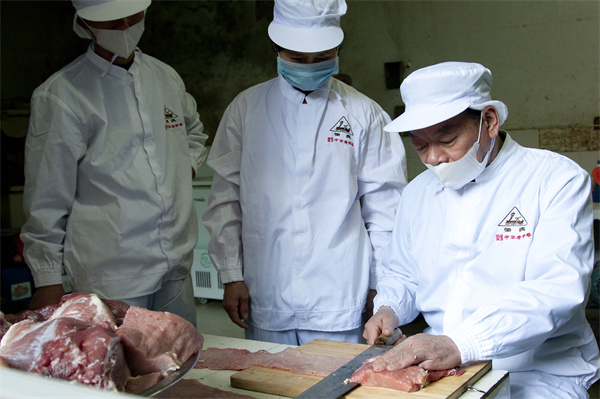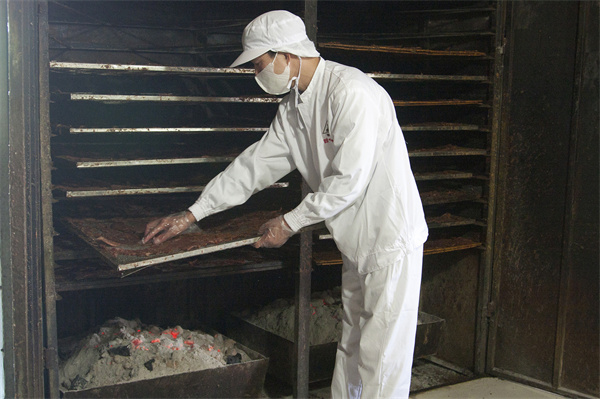 明溪肉脯干生产销售历史悠久。据《明溪县志》记载:肉脯干制作可追溯到700多年前。 明溪肉脯干以猪后腿精肉切成薄片,用山田晚季糯米加工的红粬酒糟作为辅料,加入多种名贵香料配制,经腌制后上架精心烘烤而成。成品肉脯干有三大特点:一是使用有机原料,无添加,是放心食品;二是用文火烘烤,完整地保持了肉质的纤维原纹理,色彩红润透亮;三是咸香干透,其味极香,细品入味,食后留香。“荣兴牌”肉脯干是其代表性产品,荣兴牌创建于1939年,是80年的老字号。明溪肉脯干不仅是明溪的特色食品,更是闽西八大干传统食品之一,它蕴藏着深厚的客家文化底蕴。1979年福建省政府在龙岩市召开“汀州八干”会议,明溪肉脯干被评为“闽西八大干之首”。2011年,中华人民共和国商务部授予明溪“荣兴牌”肉脯干为“中华老字号”荣誉称号。2007年8月,明溪肉脯干制作工艺入选福建省第二批非物质文化遗产名录。(三明市委宣传部 供图) 传承人罗显光在配制肉脯干所需香料。(谢煌伟 摄) 生肉切片技艺。(谢煌伟 摄) 摊肉技艺。(谢煌伟 摄) 腌制肉片。(谢煌伟 摄) 用木炭烤制肉脯干。(谢煌伟 摄) |