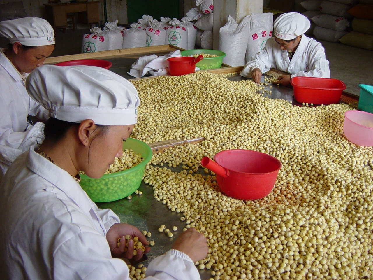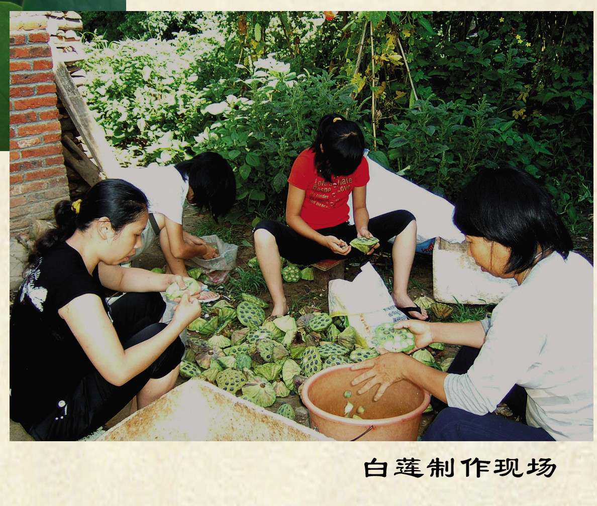 建宁通心白莲出现于五代后梁龙德元年(921年),当地莲农已在金铙山报国寺前建有白莲池,栽培、制作建宁通心白莲。 大凡一件美丽的物种,后面都有一个美丽的故事。相传古时建宁县西门外有一个后生,名叫李直,父母早逝,一人度日。一天,李直到建宁最高的铙山去砍柴,因口渴找水喝,他顺着山窝走去,找到一股清泉,李直喝完水,正要往回走,忽然看见泉水边有一枝粉红色花朵很是好看,他从没见过,就小心地把它连根带土挖了起来,带回家种在屋旁荒塘。说也怪,这花很快长成了一片,把池塘塞得满满当当。入夏,李直见这些花结出了一个个像蜂窝状的绿球果,他剥开果壳,见果肉白嫩,尝一尝,一股清甜沁入心怀。李直高兴极了,忙把它分给乡亲们尝尝鲜。从此,莲子在建宁西门外扎下了根,李直和乡亲们开了99口莲塘,通通种上莲子,至今这99口莲塘所产莲子仍是建莲中的上品。 建宁通心白莲制作枝艺的主要特征是手工制作。工艺要求精细,工序一道扣一环,机器无法代替,制作者手脚必须灵活,剥制轻巧,不伤莲肉,基本上是由18-40周岁的女性来完成,一天只能制作20来斤,且几道工序必须在当天完成,以保证成品的新鲜度。建宁通心白莲制作技艺原先是家庭传承为主,后逐步发展到家乡传承,市场化后才进入集约化传承。随着现代科技的发展,剥制机械的出现,通心白莲的机械化生产降低了成本也提高了效率,手工制作的就越来越少了。1959年,北京举行建国十周年庆典,上级指示中央苏区县建宁派1名代表晋京。为表达老区人民对毛主席当年亲手挖过塘泥的感恩之情,建宁特意请了10名17、8岁的少女,清晨采摘西门建莲,赶在上午用玉牙咬莲壳、剥好、焙干,从中精选10斤,由红军时期的县儿童团团长之弟肖瑞兰为出席建国十周年的观礼代表,带上建莲晋京,代表老区人民情怀,呈送给毛主席。2009年5月,建宁通心白莲制作技艺入选福建省第三批非物质文化遗产名录。(三明市委宣传部 供图) 分拣 |