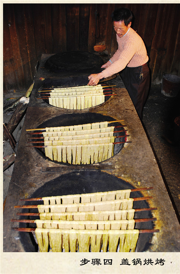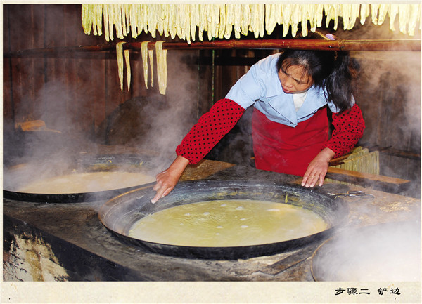 清流县嵩溪豆腐皮制作始于清嘉庆六年(1801年)。最初称“笋皮”,是用豆浆煮熟时,所产生的漂浮块片,捞起晾干而成。经过几代师傅的摸索、磨练,工艺日益完善,特别是解放后,1956年,在制浆前辈们的苦心钻研,精细加工下,豆腐皮成品益发透明,爽亮,还具有清凉、滋阴之功效,是大小宴席必备佳品,嵩溪豆腐皮也随之名声日隆,成为清流县名特产品。 嵩溪豆腐皮制作技艺主要特点是: 1、纯手工制作、风味独特; 2、农民以户为单位分散自主经营; 3、制作过程中不添加任何辅料,为纯天然绿色食品; 4、制作工序严格,须经选豆、去皮、浸泡、磨浆、过滤、煮浆、熬皮、揭皮、晾干、熬浆、上浆、烘烤、摊晾、包装等多道工序,缺一不可。 如此精细的工艺,造就了嵩溪豆腐皮的香、醇、甜、韧、一煮就熟、久煮不糊、食用方便等特点,是高品质的绿色食品。 原料的选择也有讲究,只用本地种植的“浙春3号”大豆,该品种具有高蛋白、低脂肪的特点。经国家技术质量监督局检测,嵩溪豆腐皮含蛋白质45%、多糖21%、脂肪14%,还有较多人体必须的微量元素、维生素、氨基酸,如:钙、镁、磷、钾、铁、铜、锌、锶、硒、锰、硫胺素、核黄素等, 易吸收,其营养价值很高。2009年5月,嵩溪豆腐皮传统制作技艺入选福建省第三批非物质文化遗产名录。(三明市委宣传部 供图) 成品豆腐皮 黄豆脱壳浸泡 |