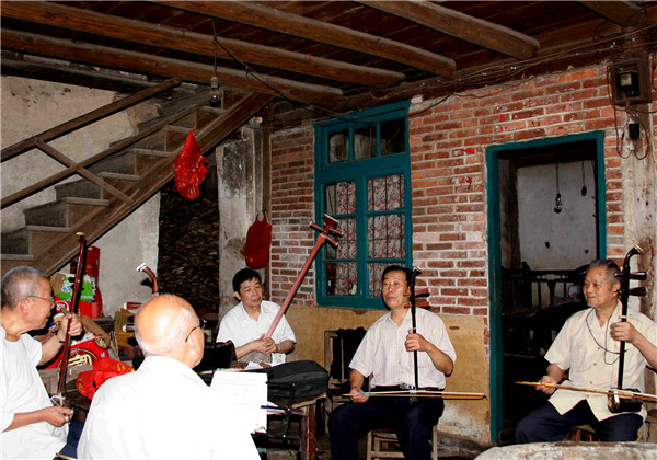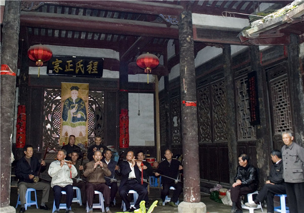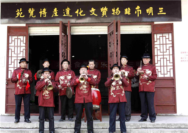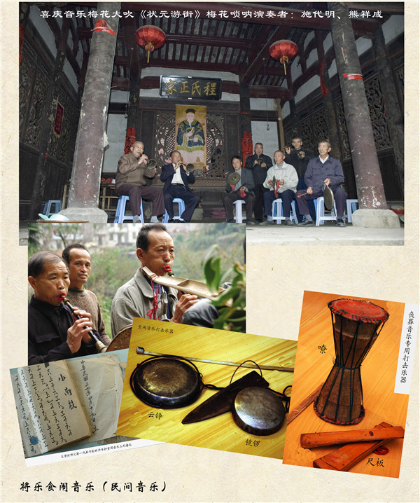 将乐食闹音乐是福建传统音乐中独特的品种,缘起将乐民俗,在民间流传广泛,至今已传承至第五代。 食闹音乐曲牌丰富,分为喜庆音乐、龙灯锣鼓和丧葬音乐。喜庆音乐又分文场和武场两种,文场喜庆曲牌有:《金纽丝》《翰香坛》《天仙子》《五调闹长沙》《闹长沙》《普庵咒》,还有一种特别的文场形式叫“闹香花坛”,即乐队踩街,以演奏江南小曲为主,多用于旧时迎神赛会;武场喜庆曲牌有:《状元游街》《将军令》《一枝花》《得胜令》《广东歌》《大马队》《闹长沙》;龙灯锣鼓可在喜庆曲牌的基础上加上特定的踩街、入户、回龙、舞龙等锣鼓乐段;丧葬曲谱则是一个完全独立、绝对不能与其他音乐混用的套曲。常用的曲牌有:《祭坛箫》《七星箫》《沙王箫》《拜箫》《清字箫》《天开门》《泣颜回》《锦毛祠》《斋金纽丝》《斋大马队》和《七星鼓》《七星箫鼓》等。“食闹”使用的乐器有梅花(大唢呐、大吹)、喳子(小唢呐)、横竹(笛子)、椰胡、二胡、琵琶、三弦、扬琴、鼓、平锣、小锣、大钹、小钹、镜锣和云铮等。 将乐食闹音乐根植于民俗生活,运用十分普及。在逢年过节、迎神赛会、结婚寿诞和节庆舞龙等喜庆场面和丧葬仪式等民俗活动中曾有着不可替代的作用。它给将乐百姓带来生活娱乐的同时也成为音乐熏陶、传播的重要方法。2011年12月,将乐食闹音乐入选福建省第四批非物质文化遗产名录。(三明市委宣传部 供图) 2015年春节期间将乐食闹音乐走进三明 非遗博览苑展示 将乐食闹传承人王渭滨(右2)与食闹乐友交流活动 将乐食闹乐队客串文艺晚会乐队伴奏 将乐食闹乐队在喜庆音乐中演奏喳子文场 |