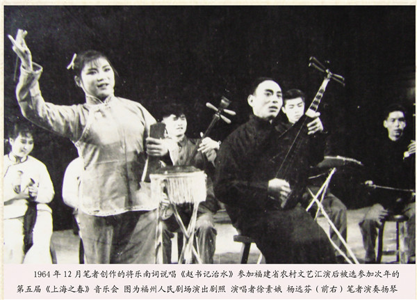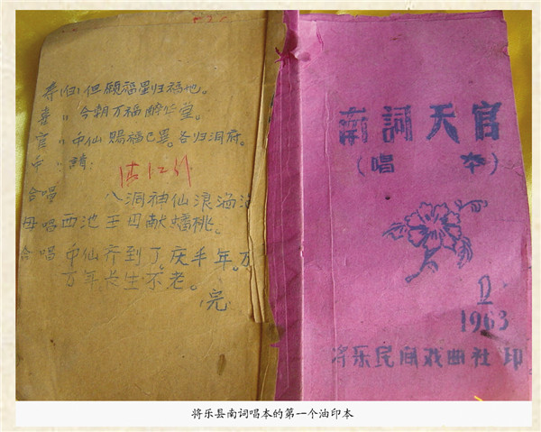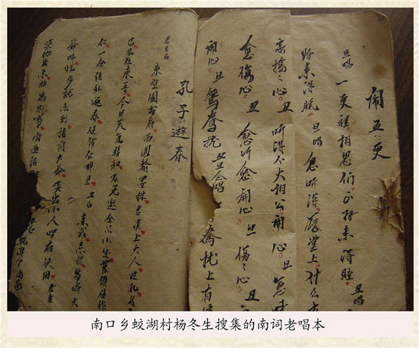 将乐南词发端于清乾隆、嘉庆年间,由于一个完整的唱段至少由八句唱词组成,故谓之“八韵南词”。 将乐南词唱腔优美,音调委婉,结构简练。其唱腔由六个部分组成,分别为基本唱腔(含平板和紧板,平板也称正板、正韵)、弦索、昆腔、北调、引子及尾声和外调。基本唱腔是南词的主要唱腔,其他唱腔则为辅助或点缀唱腔。引子和尾声只在一个所谓全本戏中使用。南词唱腔的板式与其他戏曲音乐一样,有一板三眼、一板一眼、有板无眼和无板无眼四种。原为戏曲音乐的南词,传到将乐之后即以厅堂坐唱的表演方式出现,较多地保留了清代时期的原貌,但在清唱南词中还是可以发现一些专门角色的唱腔痕迹。从演唱角度看,南词唱腔与其他戏曲音乐并没有什么区别,也有一个完整的演唱结构:起板—基本曲调—转板—结束。 南词是以清唱方式进入将乐的,所以它的伴奏只有文场(琴箫),没有武场(锣鼓)。正规的传统南词清唱使用的乐器有葫壳琴、二胡、扬琴、琵琶、三弦等。唢呐只专用于点绛引的伴奏。当出现昆腔或者外调时,则须加入箫、笛,指挥乐队的打击乐器有鲍鼓和尺板。 将乐闽北南词代表性的节目《天官赐福》,是唯一完整保留下来的唱本,也是唯一全部唱腔被完整传递下来的节目。演唱《天官赐福》在将乐被称为“开天官”,演唱前后须燃放烟花爆竹,演员盛装出场,气氛喜庆,深受将乐百姓的喜爱。目前,将乐县收存有南词传统曲目《断桥相会》《合钵收妖》《芦林相会》《昭君和番》等“四大曲王”和其他剧目及折子戏、小戏等18本。 近年来在广大南词艺术爱好者的共同努力下,南词创作、演绎活动方兴未艾。特别是在2009年将乐县南词艺术研究会成立以来,通过积极作为,组织南词艺术演出、展示、传习,新编南词代表作《抢险英雄郑忠华》《党是人民的铁靠山》《将乐美、将乐乐》《李寄斩蛇》《山无粮水无税》《程门立雪》《香樟颂》等作品相继问世,在全国及省、市曲艺比赛和展演中获得各类奖项20余项,将乐南词重现兴盛希望。2011年12月,闽北南词(将乐)入选福建省第四批非物质文化遗产名录。(三明市委宣传部 供图) 2013年在将乐文艺名家系列讲坛上,将乐南词传承人刘怀中(左)在与学员分析讲解南词唱腔 将乐南词传承人刘怀中创作的南词新作《抢险英雄郑中华》登上舞台 将乐南词传承人刘怀中在指导演唱南词《天官赐福》 将乐南词说唱《李寄斩蛇》喜获全国第六届少儿曲艺大赛三等奖 将乐县南词唱本的第一个油印本 南词《赵书记治水》剧照 南词表演唱《将乐美、将乐乐》参加中央电视台“大风车节目录制” 南口乡蛟湖村杨冬生搜集的南词老唱本 |