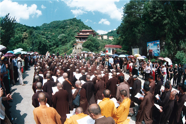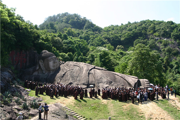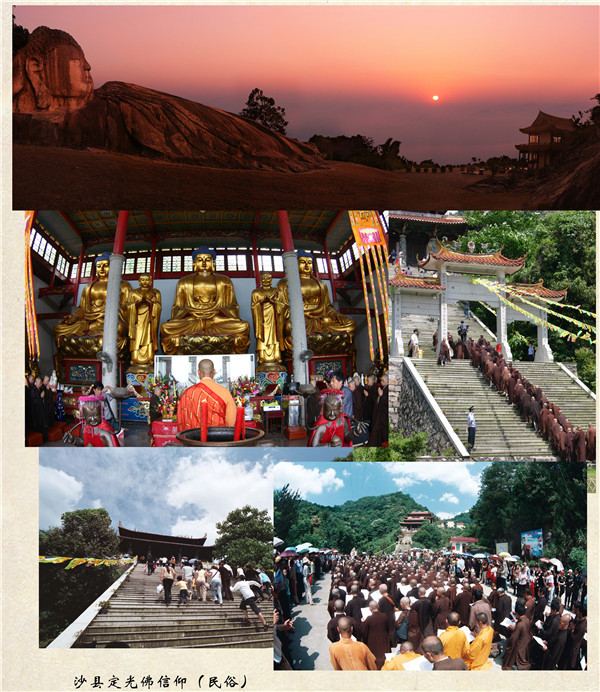 定光佛信俗在沙县民间流行始于唐宋年间,其时城郊淘金山、洞天岩一带的佛寺,均供奉定光佛,民间信仰盛行。 沙县较大型的定光佛信俗活动均按照佛教传统,每年3次,一是农历正月十二定光佛的诞生日;二是农历三月二十七定光佛的出家日;三是农历八月二十二定光佛成道日。沙县民间视这3个日子为定光佛的诞辰日,民众和佛教僧众都要举办大型法会,邻近乡镇的信徒也都早早赶到寺庙焚香礼拜。定光佛的事迹传说在民间流传甚广,如祷雨救旱、驯服野兽、活泉止水、治河护航、赐嗣送子、避免战祸等等,这些事迹正是原住民客家先人们艰苦创业的真实写照。 旧版《沙县志》还记载了定光佛与北宋名臣李纲的结缘。据载宋宣和元年(1119年)李纲因京都大水,民不聊生,上书谏请皇上积德行善,龙颜震怒,被贬为沙县监税官,李纲常忧国事,一日郁闷,来到城西大洲漫步,见一僧人过河,竟足不沾水,凭虚而渡,李纲知非常人,一路尾随至洞天岩,见僧人盘坐岩石上闭目小憩,遂恭立静候,待僧人醒来,李纲作揖求问前程,僧人口占四句:“青着立,米去皮,那时节,再光辉。”李纲欲进一步请教国事,僧人不语,径自踏上云步桥,乘云而去。靖康之年,李纲复出,竟应验了那僧人所言,据称那僧人便是定光佛的化身。李纲为纪念这段佛缘,请工匠雕造了定光佛睡像,供奉在所见之处,后湮没于大规模采石之中,但古迹大佛脚印、步云桥至今仍在,大洲沙溪河中心有块沉浮石,便是当年定光佛过河时的踏脚石,如今仍会随着河水的涨落而浮沉。 定光佛信俗除沙县外,在闽西北及赣南、粤东,特别闽台客家聚居地区都有相当影响。2011年12月,定光佛信俗(沙县)入选福建省第四批非物质文化遗产名录。(三明市委宣传部 供图) 僧人入寺庙 沙县定光佛 沙县淘金山定光卧佛 庄严的祭典 |