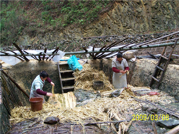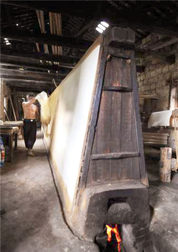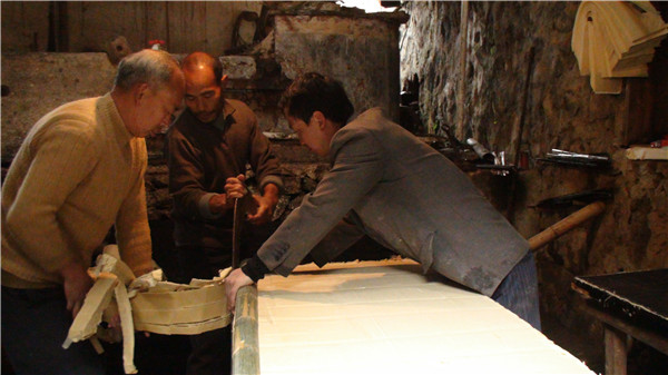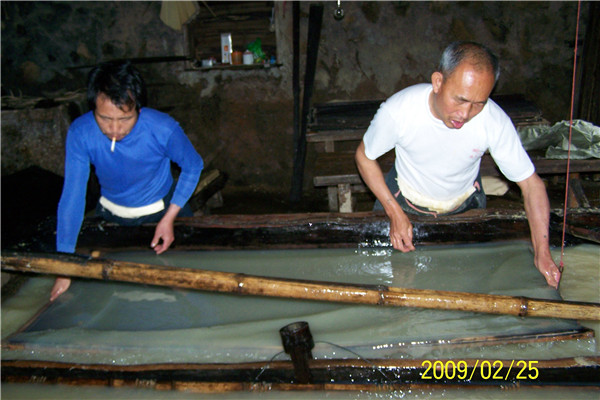 宁化玉扣纸是福建竹纤维造纸的代表性工艺之一,发祥地在宁化县治平畲族乡。《宁化县志》记载“本县猫竹可以造纸,东南乡多有之,运售闽粤江汉间”。自宋及清,朝臣书写奏折多用玉扣,因其纸质洁白可照见人面,又因奏折乃皇帝御览,故有“日鉴天颜”的美誉。 玉扣纸的得名来自于其品质的优良,玉是形容其色泽洁白如玉,扣则是纸的计量单位。玉扣纸有纸质细致柔软,平展厚薄均匀,韧性好,拉力强,不易虫蛀,保存年久等特点,被广泛应用于政府档案、寺庙经本、宗祠族谱和商行账簿。广东等沿海群众,用玉扣纸卷烟不串味,南洋侨胞用玉扣制作纸钱祭祖,认为燃烧后纸灰少而白,容易飘回故土让祖先受用。 治平乡竹林密集、水源充足而无污染的山麓谷口,建有“纸寮”,造纸作坊分槽间和焙间,以隔墙分开,所用纸槽、纸榨、踏料斗等都要严防污染。玉扣纸为纯手工技艺,技术含量高,选料、踩料、造纸、焙纸4道工序环环相扣。 一、选料: 1、砍竹麻:谷雨季节,竹笋刚落箨生枝时进行砍伐,小满则止。民谚说“竹麻不吃小满水”,此时气温上升、雨水渐多,竹笋容易霉烂变质。砍竹麻用鸳鸯斧,挖到蔸部然后砍,砍下竹麻蔸朝下放,避免溜竹时竹皮溜伤、竹筒破烂、竹肉变黑,影响纸质。 2、剖削:削劈竹蔸泥污去青皮,蔸筒、二筒也叫摆白筒全削,要求白不带青;裁成4种类型筒子,3筒削一节,半青半白,叫观音筒;尾筒不削,末端可供食用;再将竹筒剖片去节,每50片捆成一把,趁天黑前挑下山去,免受露水污染。 3、下湖:将竹片放入湖中摊平,灌水淹没,均匀地洒上石灰,竹麻经石灰水腌浸、软化、熟透,分解竹麻非纤维质。40天后,视竹麻横断面呈金黄色不带白心,即可洗净灰浆灰渣,仍将竹麻放回湖塘垫枕摊平,用清水漂净石灰碱性后盖上茅草让它烂熟,竹麻经过石灰腌浸和漂洗,具有纯洁无毒的特质。一捏纸,需配13担竹麻,100斤石灰。 二、踏料: 1、剥竹麻:洗净杂质,剔除未削净的竹节,要求无赤根、乌根、黄节、沙丁、虫壳等。 2、榨竹麻:将剥好的竹麻放入脚踏木榨中榨去水份。 3、踏竹麻:把榨干的竹麻倒进有竹笪装置的踏料斗,加入裁剩回收的纸边,两人反复踩踏,使竹麻通过竹笪磨擦成浆。要求无边子及粗根,然后倾入纸槽。踏竹麻是脚上功夫,所谓“做纸师傅看纸坨,踏料师傅看甩脚,焙纸师傅看铺坨。” 三、造纸: 1、熬蓝:“蓝”指毛冬青,上山采集,入锅蒸煮,取起后放入器皿浸沤,约待3日后汁液粘稠,滤出用作造纸时的天然添加剂。蓝的作用一是使纸面光滑润泽,二是利用其润滑度使纸浆厚薄均匀。 2、造纸:将“蓝”酌量放入装有纸浆的槽里,扛头和扛尾的造纸师傅双手抬帘床往槽里荡浆摇浪,浆浪卷过帘面,起帘到榨床上脱帘,叠至10厘米厚,榨去水分,裁去湿边;扛尾师傅要把首先出水的一角轻轻挑起,便成湿纸一张,要做到纸张片均匀,无烂尘脏点,四向刀口整齐。 四、焙纸: 焙笼的两面焙壁高1.8米,长10米,以竹篾为骨料,粉上石灰黄泥拌以竹麻皮丝踏成的粘浆,刷上桐油使焙面结实光滑。两个焙纸师傅各在一面操作,一次可烤纸28张,焙纸要求平展光滑、无破烂节张、无焙泥烟尘、蟹脚干扎等。最后按规格裁好,每200张摺成1刀。 一槽纸制作大约需要10人:剥料2人,踏料2人,做纸和扛尾2人,焙纸2人,管理人员2人。管理人员兼负责蓝的采集和熬制,并将造好的纸张发往长汀县纸行出售。纸寮人员是一个紧密合作的群体,但旧时纸寮也是等级分明的,造纸师傅地位最高,其次是焙纸师傅。用餐时,造纸师傅和焙纸师傅必须坐横头右座,两位师傅坐好,其他师傅才能落座。如果一槽有两位造纸师傅,必须开两桌,一个师傅坐一桌的横头右座。纸寮工人一天工作12小时,凌晨5点起,至晚上5、6点结束,在工班中交流不用话语,只通过手势和行为示意,这是在长期工作中产生的默契。(三明市委宣传部 供图) 砍竹蔴 剖削 浸竹蔴 下湖 剥竹蔴 踏料 做纸 焙纸 切边 |