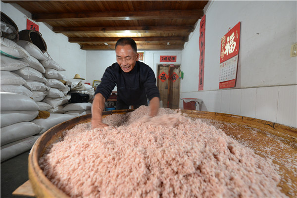 红粬是酿造黄酒的特殊粬种,为民间广泛应用。三明多地出产红粬,尤以大田建设镇“吴氏红粬”较为有名。 大田县建设镇建忠村拥全国最大的古粬窑群,在535座古粬窑中,百年以上朵窑350余座、三百年以上粬窑120余座,这些古粬窑均为建忠村吴氏祖辈所建,大多仍在使用中。“吴氏红粬”古法制作技艺乃吴氏先祖从南宋宫廷酿酒坊习得,700年间“传宗不传外,传男不传女”,心口相授,代代传承。其制粬方法古朴神秘,无固定标准可依,顺应自然,不同季节操作各异。首先选用大而圆的米粒,水泡1小时,清洗入笼大火猛蒸,蒸熟后摊在预先准备好的平台上晾至35℃,放入粬青、粬母搅拌均匀后入窖;窖内温度须随着窖藏时间的推移有所变化,窖温全凭经验掌控,秋冬温度不够,有时还须生火提温。粬料每天早中晚3次翻拌、撒水雾,一般需耗时——6-8天,直到粬料变红为止,最后拿出来晒干,如此历经15道工序,耗时150个小时,才能完成红粬的制作。 红粬古法制作技艺,是先民智慧的结晶,在历史、文化、艺术、经济等多个方面具有重要价值。酒粬本身也具有健脾消食,活血化瘀之功效,民间常用于治疗饮食积滞,脘腹胀满,赤白下痢,产后恶露不尽,跌打损伤等疾病,同时也是制粬人发家致富的重要经济来源。2019年2月,大田红粬制作技艺入选福建省第六批非物质文化遗产名录。(三明市委宣传部 供图) 酵母。 搅拌“粬饭”。 古窑发酵。 发酵后的红粬半成品。 筛细红粬。 晾晒。 红粬成品。 制作工具。 制作工具。 制作工具。 |